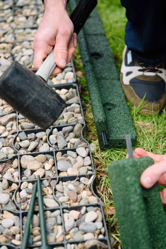 Die FlexiBorder werden mit Nylonstiften im Boden befestigt (diese sind natürlich in Ihrer Lieferung enthalten). Wenn Sie mit der Platzierung zufrieden sind, können Sie die einzelnen Abschnitte der Umrandung an dem festgelegten Platz befestigen. Wenn Sie organische Flächen mit Rundungen einfassen, ziehen es manche Anwender vor, die Kanten nach und nach zu befestigen. Es liegt an Ihnen, welche Methode am besten funktioniert. Die Erdnägel können einfach mit einem (Gummi-)Hammer im Erdboden befestigt werden.