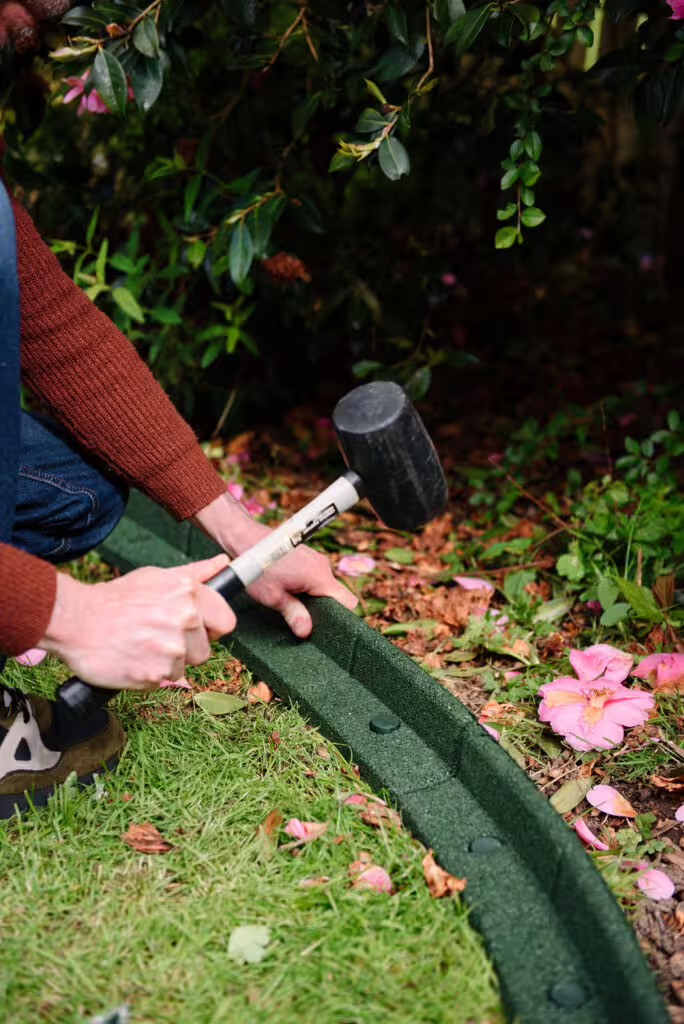 Dies ist ein wichtiger Schritt, damit Sie die Abgrenzung genau dort verlegen können, wo Sie es planen. Jeder Abschnitt der Umrandung ist 8 cm breit und 8 cm tief, so dass Sie eine Vorstellung davon bekommen, wie tief Sie in den Boden graben müssen. Oder platzieren Sie die Umrandung einfach an der gewünschten Stelle und befestigen Sie sie mit den mitgelieferten farbcodierten Stiften.